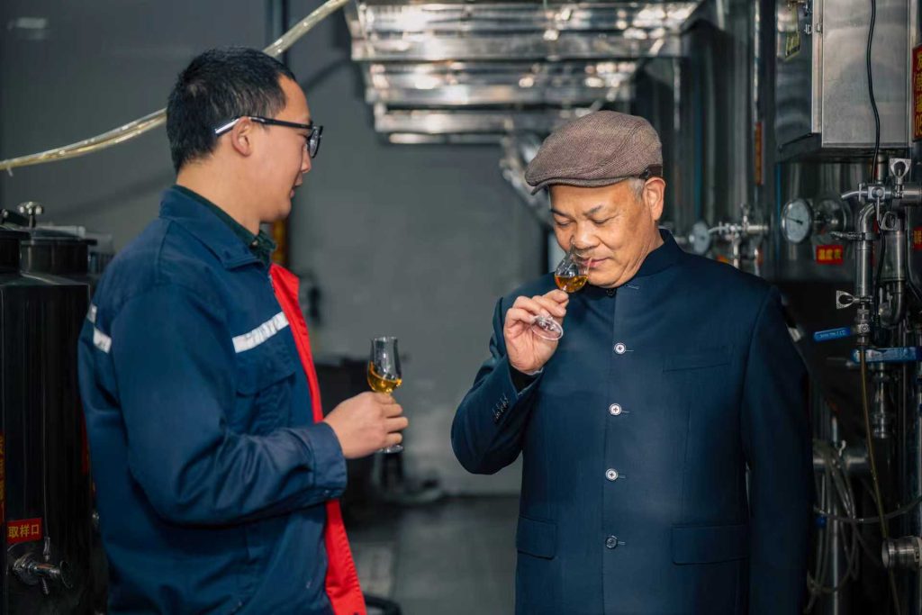 In the photo on the left, Pan Xingxiang, chief advisor to Kuaijishan, stirs a vat of fermenting rice wine with a rake, helping micro-organisms break down glucose—a key step that determines the quality of the final product. In the photo on the right, Pan tastes fizzy rice wine alongside a disciple and fellow brewer. Pan is a nationally recognized yellow wine master and a national-level inheritor of intangible cultural heritage. —— Photos courtesy of Pan Xingxiang