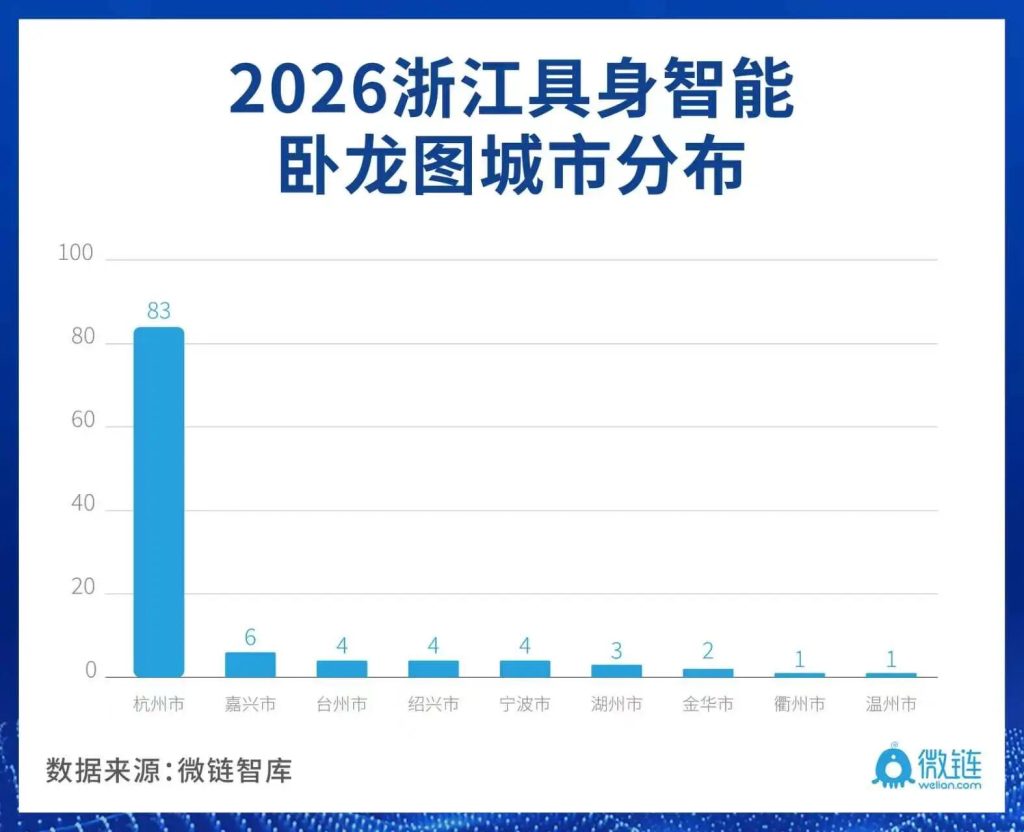 The breakdown highlights a “hub-and-network” structure, with Hangzhou leading innovation while other cities contribute manufacturing capacity and niche expertise, forming a coordinated regional ecosystem for embodied AI.